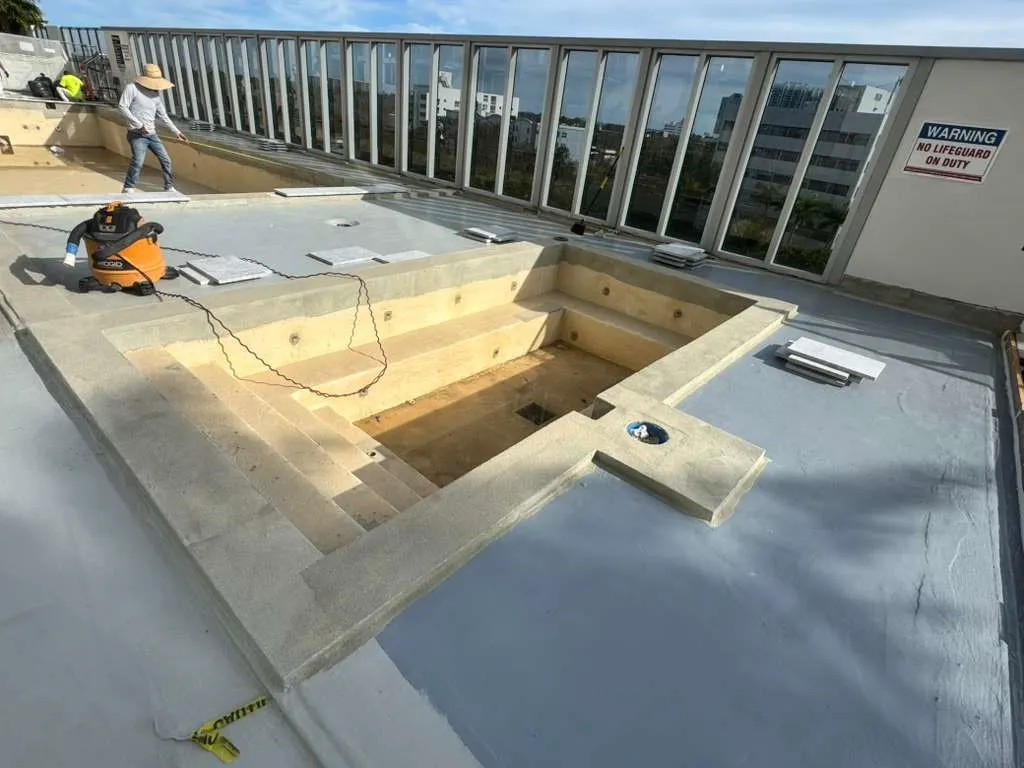 Pool decks require “traffic coatings”—specialized waterproof layers that are durable enough to be walked on while remaining flexible enough to keep the pool area watertight.